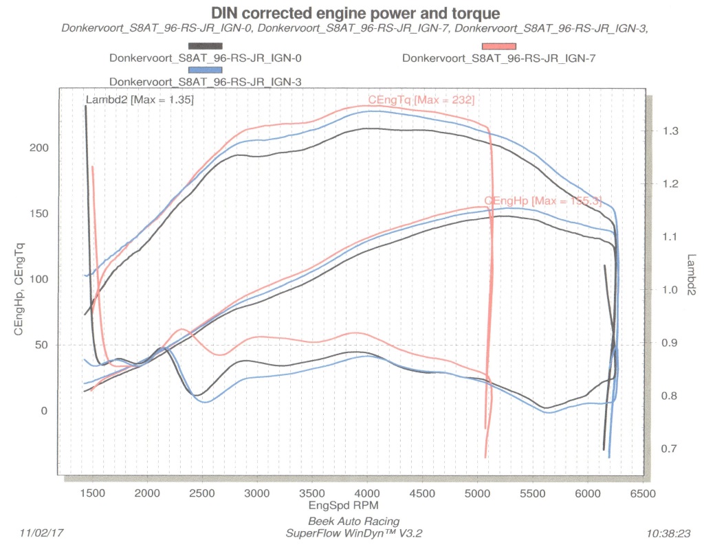 Grafieken van de drie runs. De rode grafiek is met de ontsteking initieel op 7 graden BTDC, afgebroken bij 5000 toeren in verband met detonatie. De zwarte grafiek is met de ontsteking initieel op 0 graden (= TDC). De blauwe grafiek is zoals het uiteindelijk is geworden, ontsteking op 3 graden BTDC en geen last van detonatie. Het maximaal haalbare.